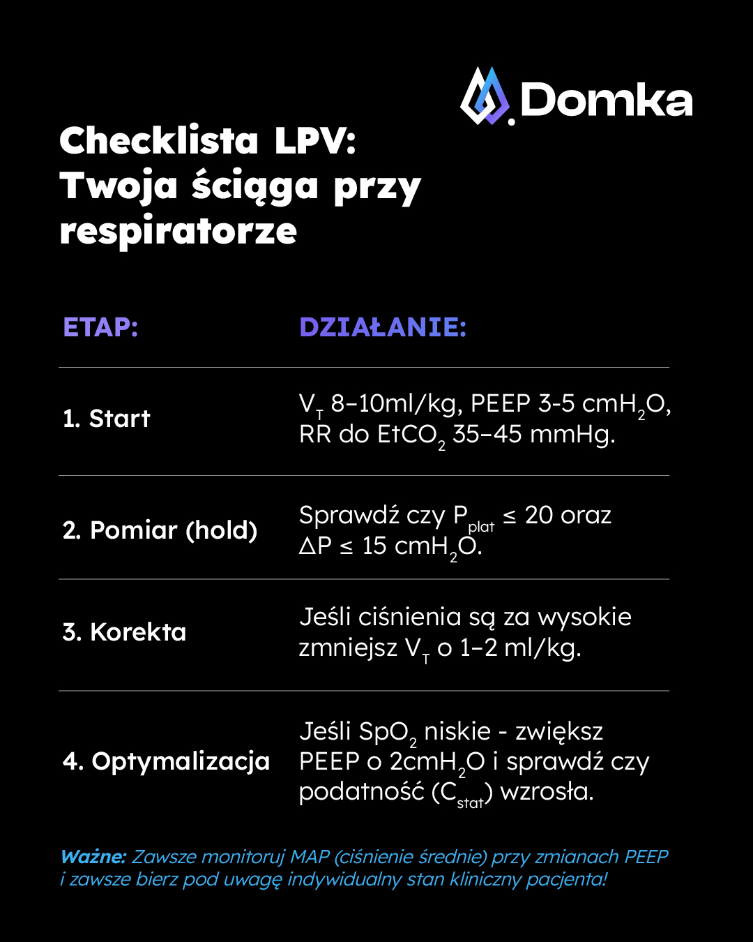Poniższy materiał ma charakter edukacyjny i stanowi praktyczną ściągę opartą na powszechnie przyjmowanych założeniach wentylacji ochronnej. Nie zastępuje oceny klinicznej ani decyzji lekarza prowadzącego. Ustawienia należy zawsze dostosować do pacjenta, przebiegu zabiegu oraz dostępnego sprzętu, a wszelkie zmiany prowadzić w oparciu o monitoring oddechowy i hemodynamiczny.